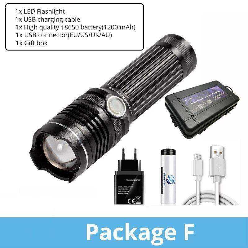 G:1x LED flashlight 1x USB charging cable 1x Hight quality 26650 battery 1x USB plug 1x Gift box