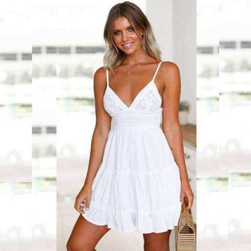New V Neck Lace Backless Spaghetti Strap Summer Dress