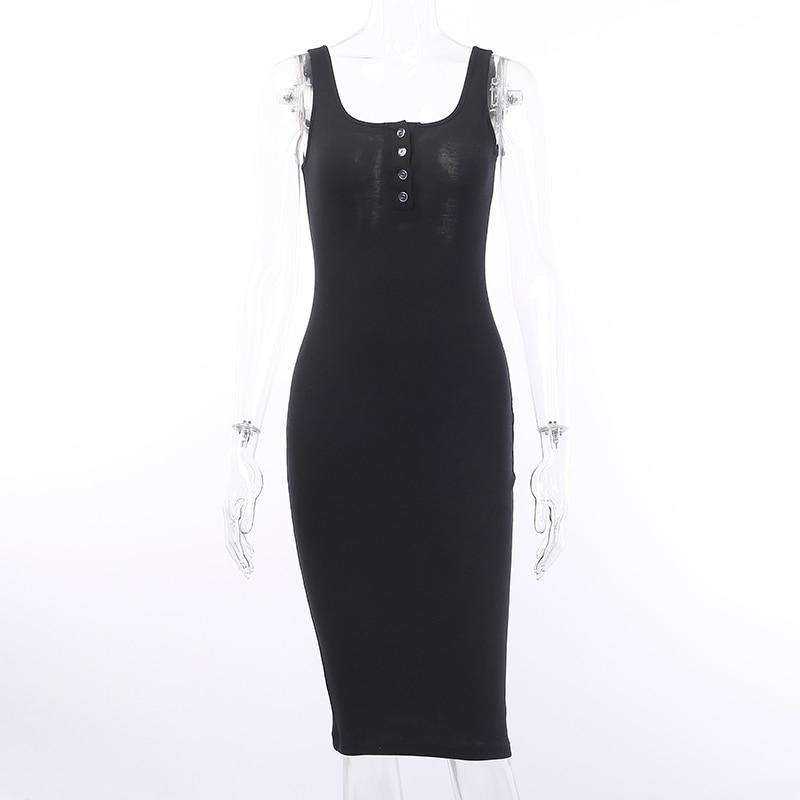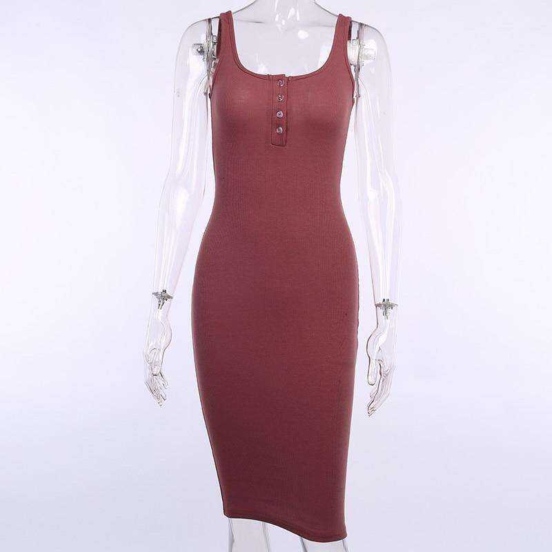 1x Knitted Elastic V-Neck Button Sleeveless Knee-Length Slim Dress