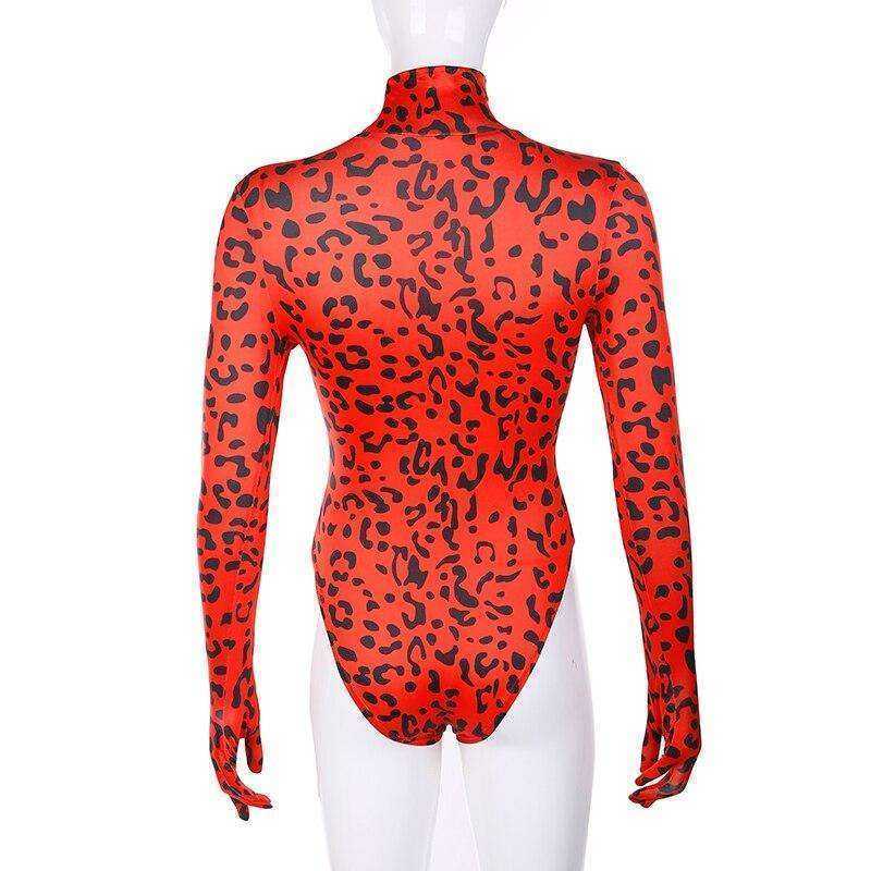 Red Leopard Print Turtleneck Bodysuit with Gloves Autumn Skinny Body Long Sleeve
