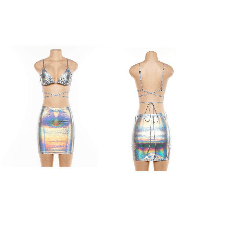 • Silver Glitter Sexy Two Piece Skirt Set Tops