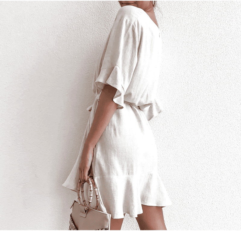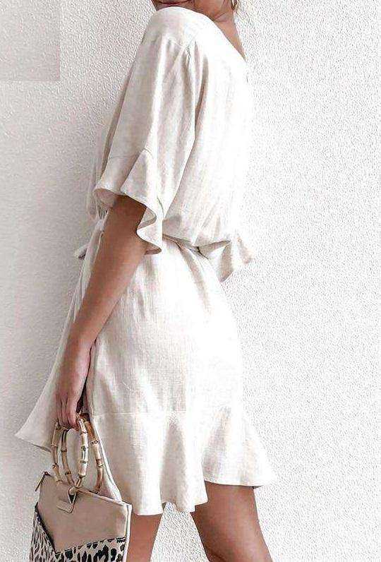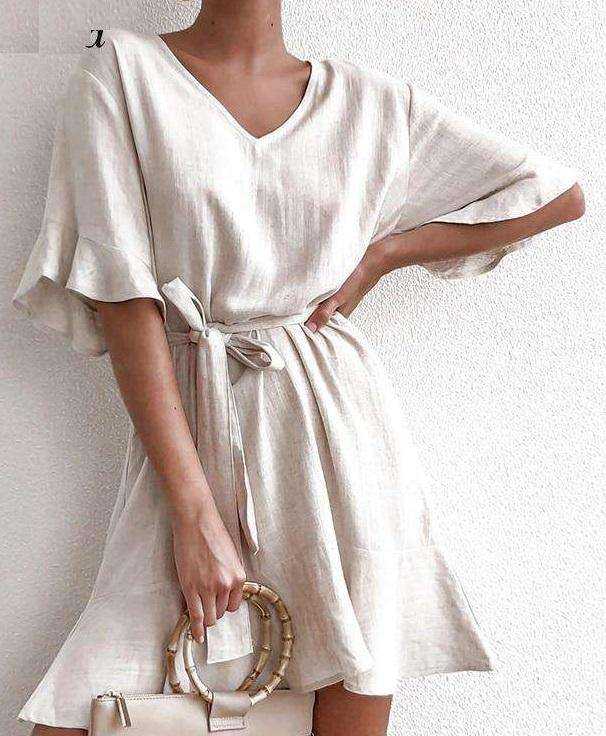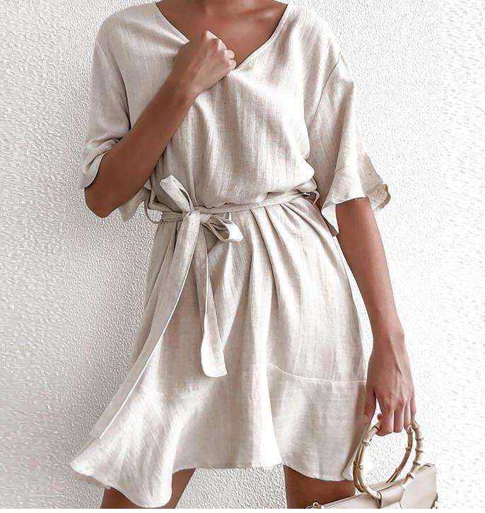 Grab your Discounted Solid Cotton Linen Short Sleeve V Neck Mini A-line Summer Dress while the New Product LAUNCH DISCOUNT is on. Once the sale countdown timer is over, we will be increasing the price back up to $59.99. This is absolutely a great gift!
