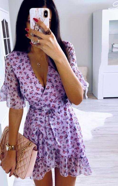 Women Sexy V Neck Lilac Floral Wrap Dress