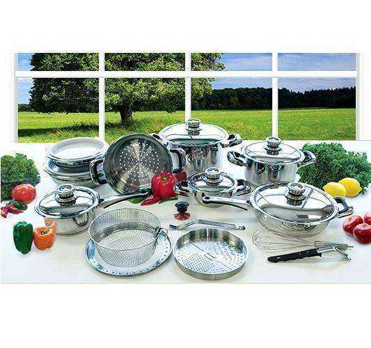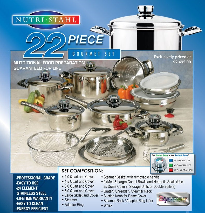 Nutri-Stahl cookware gives you every reason to enjoy the art of cooking. Your commercial quality cookware comes with both water-less and nutritional capability and is also induction-ready. The sturdy surgical stainless steel craftsmanship insures a durable and easy to clean surface. The 22 Piece Surgical Stainless Gourmet Cooking Set has been manufactured by Nutri-Stahl, each piece is backed by a 100% Lifetime Warranty Guaranteed!