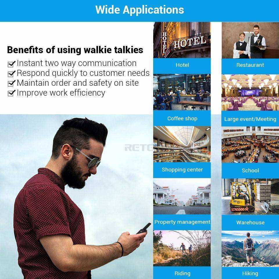 • Retevis RT618/RT18 walkie talkie is suitable for a variety of occasions and a variety of people ,can be widely used in big mall, restaurant, hotel, coffee shop, KTV, Bar, warehouse, property management, travel, hunting and so on.
